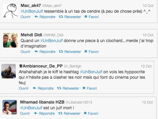 Ne vous y trompez pas, la haine en ligne existait d’ores et déjà du temps de Twitter, comme nous le montre la viralité de l’hashtag #UnBonjuif en 2012. De fait, il était arrivé 3èmemot-clé le plus populaire sur la plateforme, véhiculant stéréotypes antisémites et appels au meurtre.