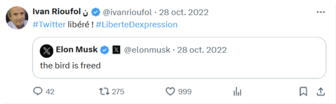 Cette dynamique de l’individu informateur à entrainé sur X un mouvement de libération du débat public. Ce réseau social devenant le symbole d’une expression libre.